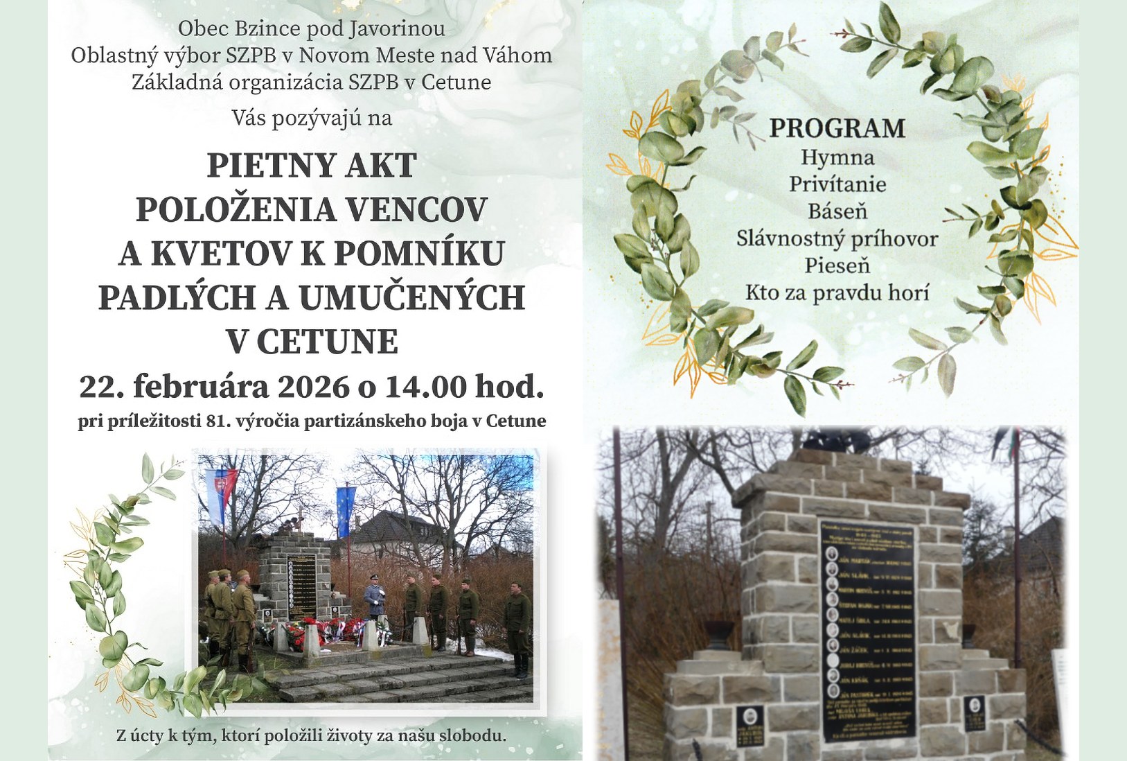 Pietny akt sa uskutoční v nedeľu 22. februára 2026 o 14. hodine pri príležitosti 81. výročia partizánskeho boja v Cetune. Z úcty k tým, ktorí položili životy za našu slobodu.
