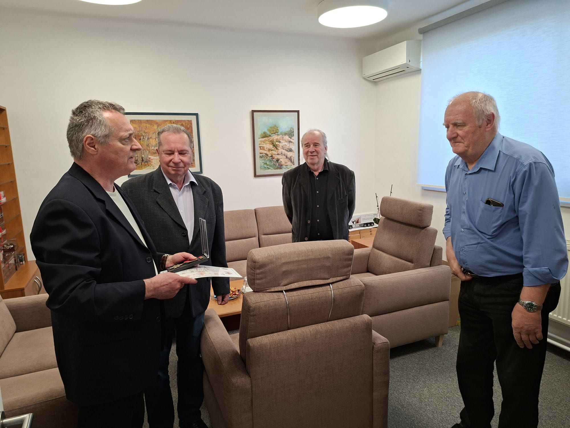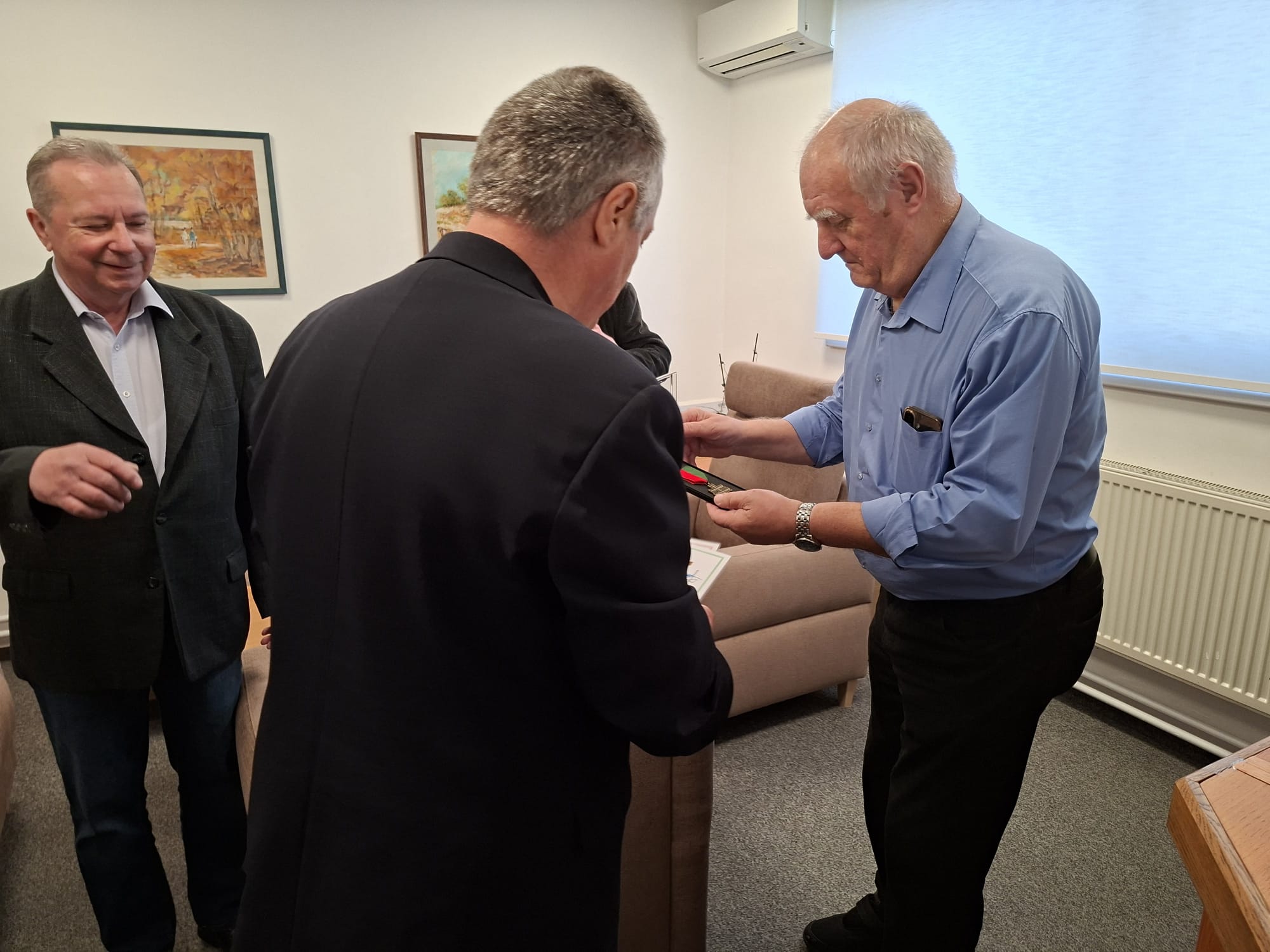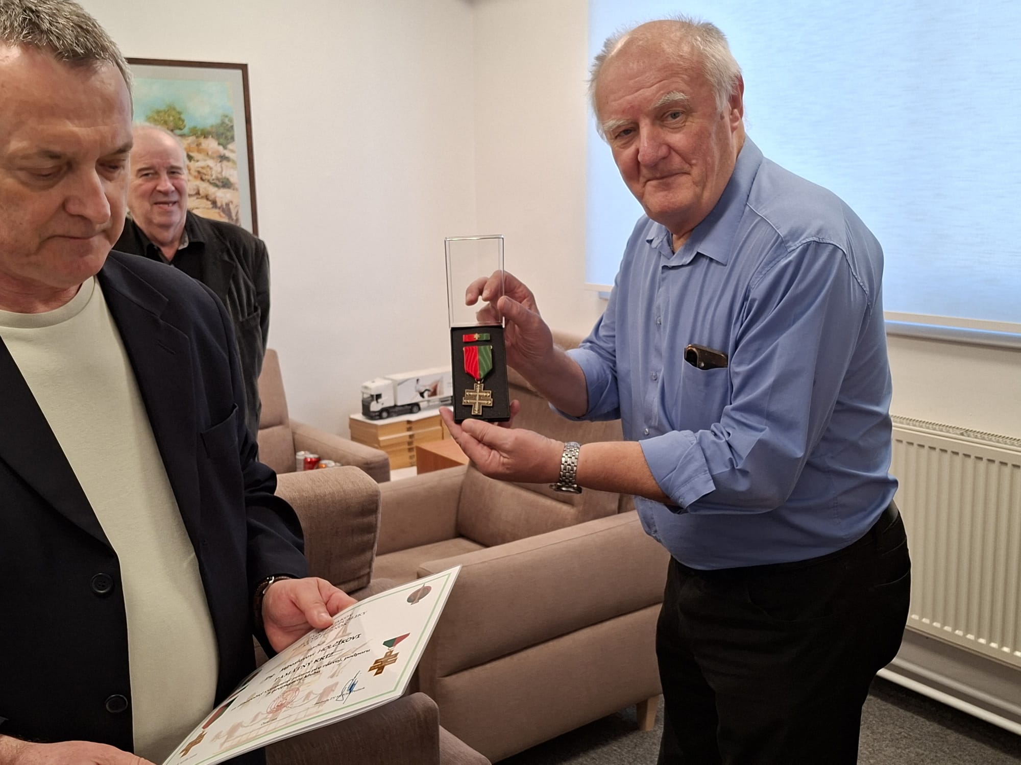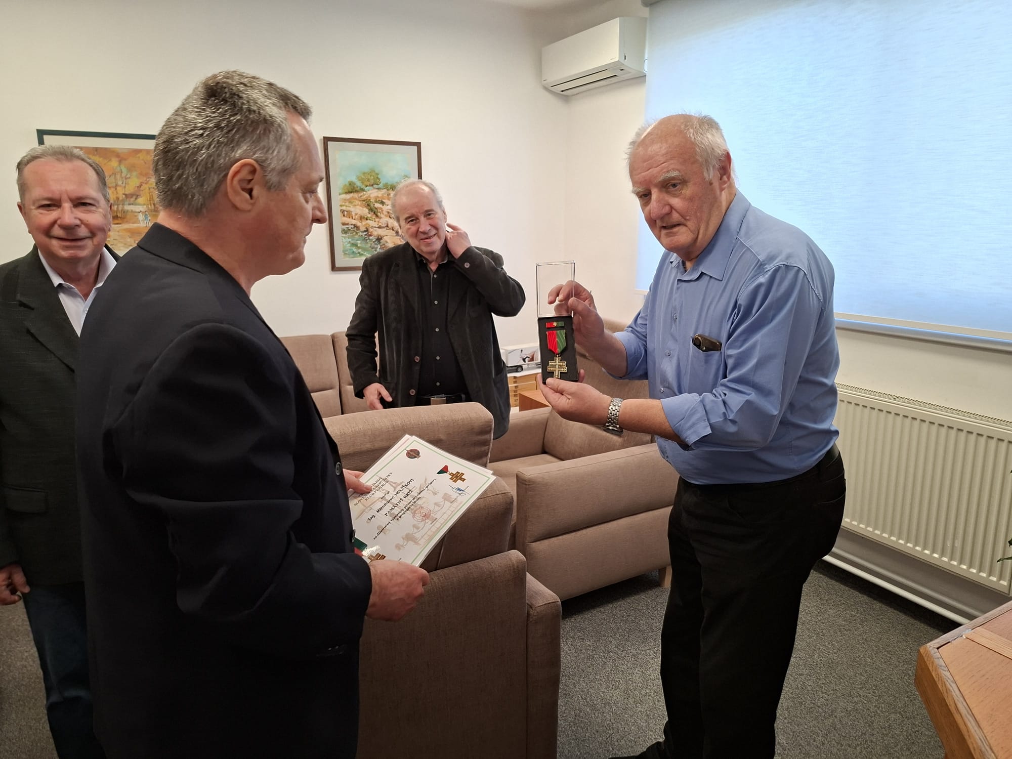 Členovia ZV SR Klub Pezinok plk. v.v. Ing. Stanislav ŠIMON, plk. v.v. Ing. Milan VIGLASKÝ a nprap. v.v. Ernest HAJNOVIČ dňa 8. apríla 2026 o 09:00 hod. odovzdali podporovateľovi/sympatizantovi klubu, pri príležitosti významného životného jubilea 75. narodenín najvyššie klubové ocenenie Pamätný kríž ZV SR Klub Pezinok Ing. Miroslavovi HOLČÍKOVI.