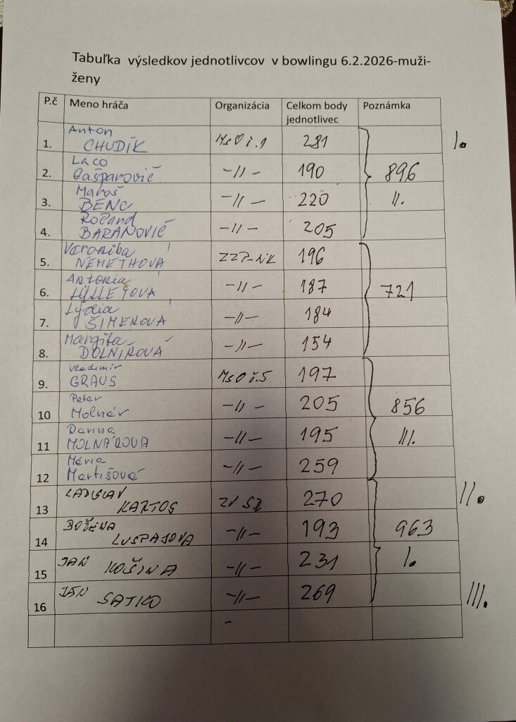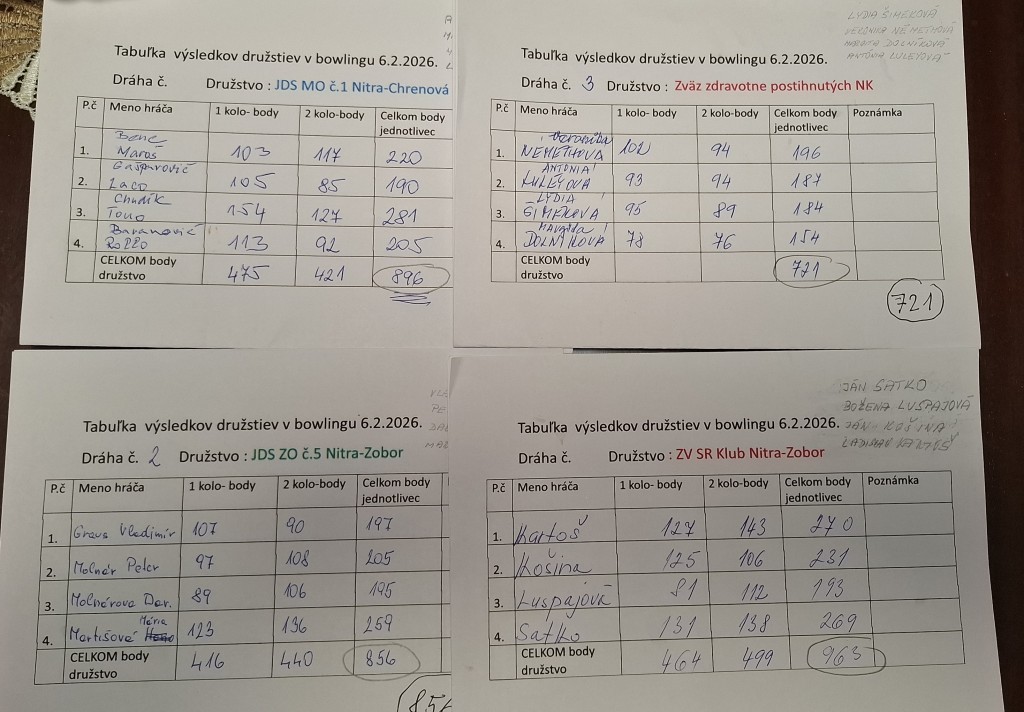 Dňa 6. 2. 2026 zorganizoval ZV SR Klub Nitra – Zobor „Novoročný bowlingový turnaj“ pre členov klubu a pozvané družstvá z družobných organizácií MsO JDS č.1 Nitra- mesto, MsO JDS č.5 Nitra- Zobor, Zväz zdravotne postihnutých Nitrianskeho kraja. Z každej účastníckej organizácie hralo štvorčlenné družstvo na dve súťažné kolá po dobu jednej hodiny. Víťazom bolo družstvo s najväčším počtom dosiahnutých bodov. Vyhodnotili sme aj najlepšieho jednotlivca. Celkom bolo prítomných 16 hráčov a asi 30-fanúšikov, ktorí prišli povzbudiť svoje družstvá.